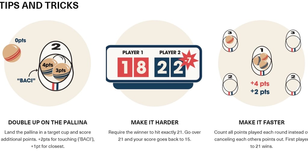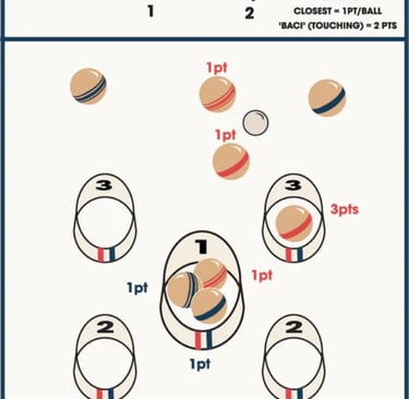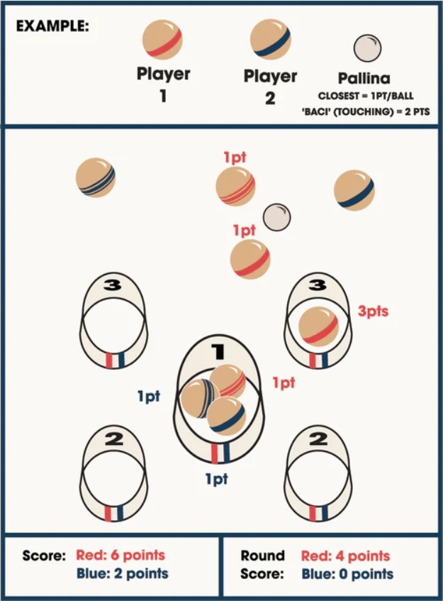 Similar to bocce, the player closest to the pallina earns one point for every ball closer than the opponents nearest ball. The player with the highest score subtracts their opponents score from their own.