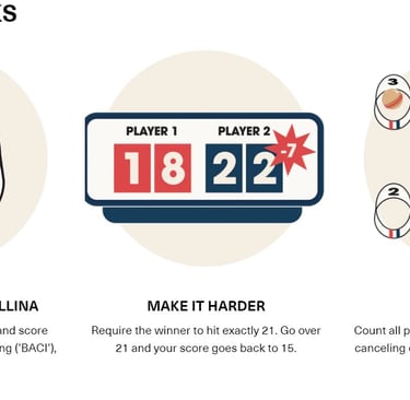 To Score: (1) Players earn the # of points marked on each target for every ball that lands in that target (2) Similar to bocce, the player closest to the pallina earns one point for every ball closer than the opponents score from their own.